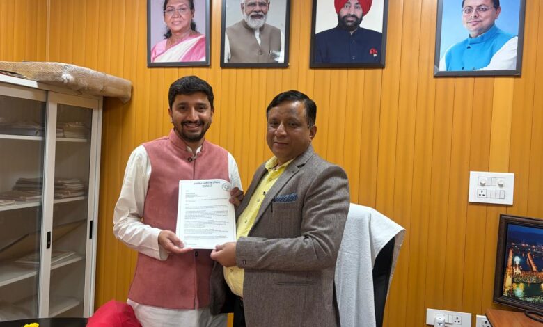एमडीडीए उपाध्यक्ष को ज्ञापन देते भाजयुमो प्रदेश मंत्री आर्यन देव उनियाल।